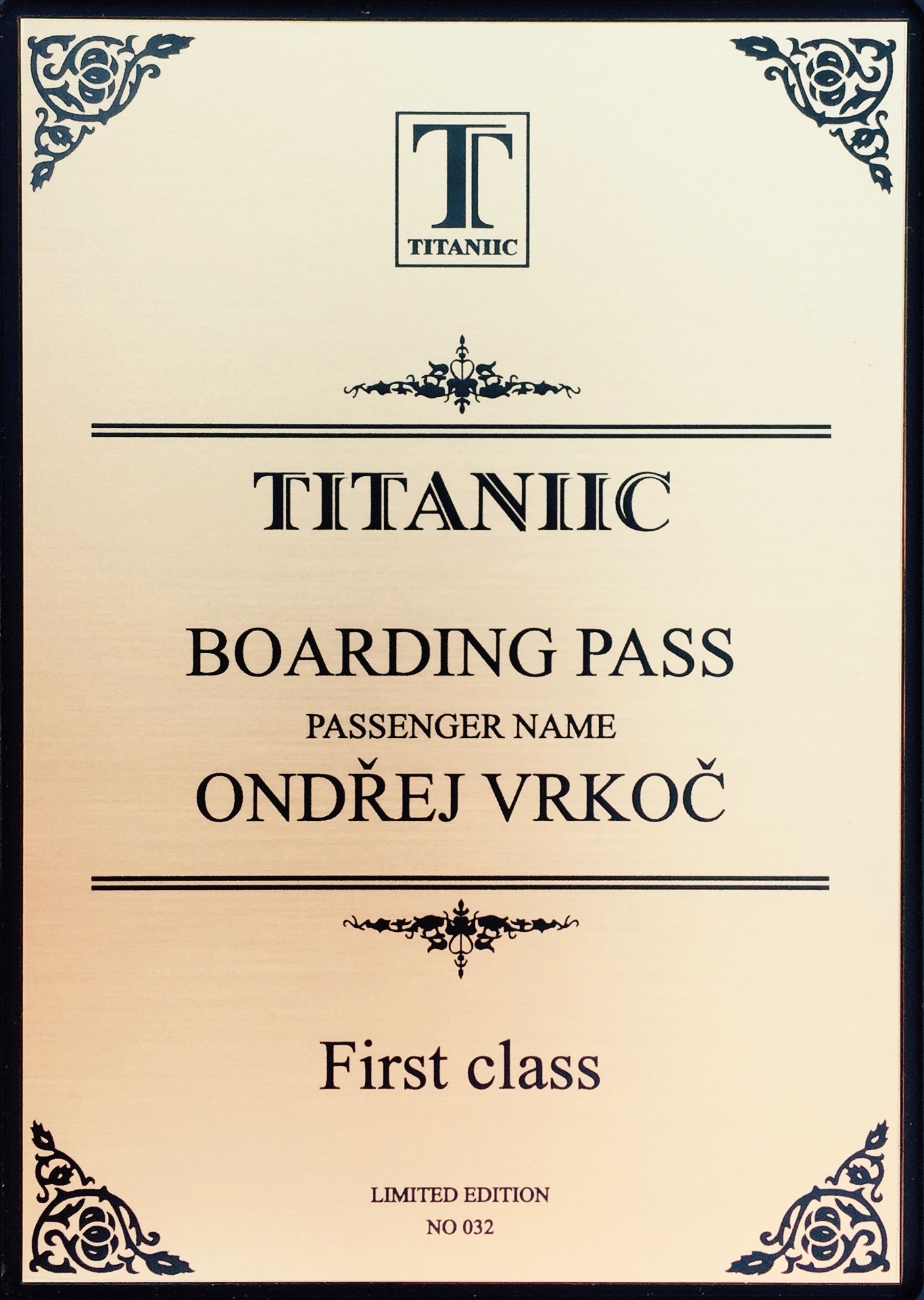 Electronic certificate TITANIIC with your name, your address and the number of the limited edition. The certificate is personally signed by the creator of the project, Ondřej Vrkoč.